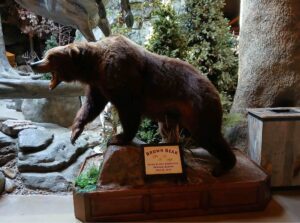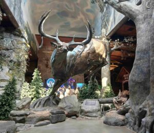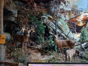 The entire store is a nature museum in itself, with dozens of wildlife exhibits. You’ll want to stroll the entire store (it is HUGE). Watch for deer, elk, and bears, probably wolves, too, but I seem to have missed them.